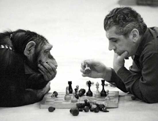 Chimps can be taught sign language, to count, perhaps to ride a bike, or create rudimentary tools to accomplish a task. But that is where it ends for them. (does it? I ask) That has been the height of their evolution. (is it? I ask)