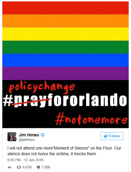 On Monday afternoon, Rep. Jim Himes (D-Conn.), took to the floor of the House to address the shootings in Orlando. Unlike many of his colleagues in Congress, Himes said, he would not be participating in any moment of silence for the victims.